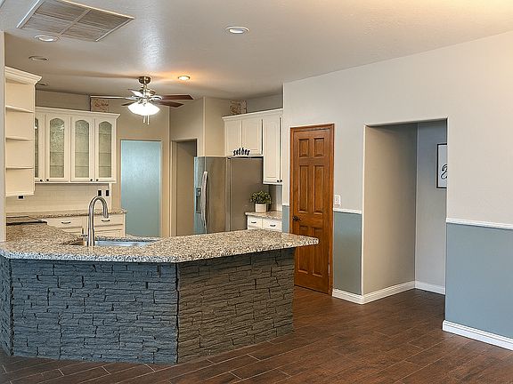 Fenced yardGranite counter topsSitting areaWood-look tile floorsVaulted ceilings