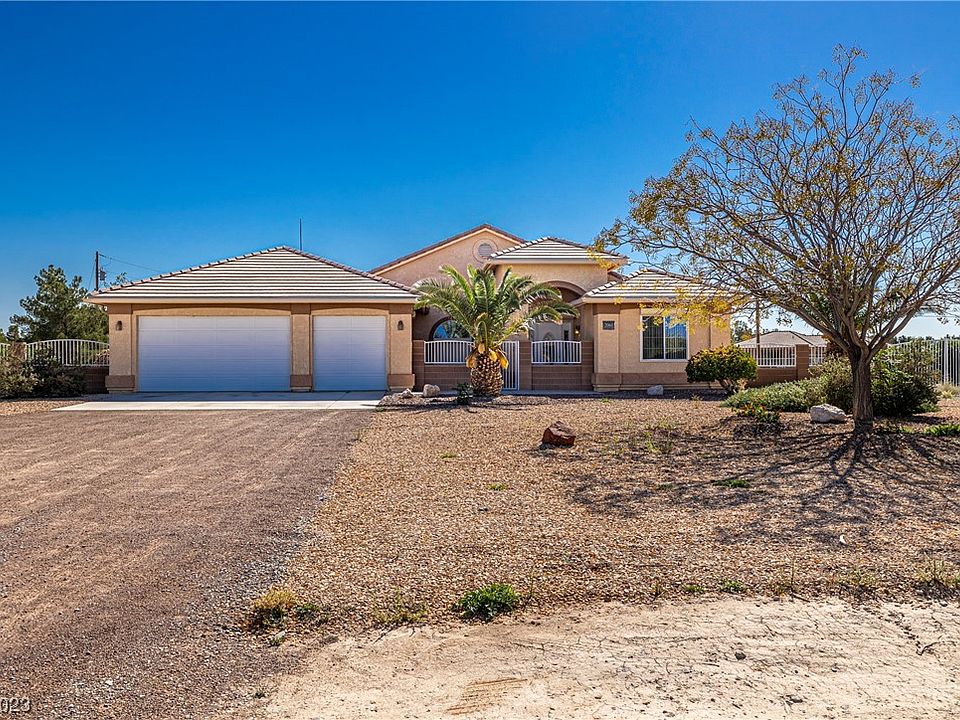 Gorgeous custom-built home in the heart of Pahrump sitting on over an acre with a heated pool, electric roll down security/privacy shutters on all windows and solar electric that is paid off in full! You won't want to miss this one! This beautiful home has 3 beds and 2 baths. The kitchen boasts granite countertops, stainless appliances, and large walk-in pantry, and separate office area off the garage. Primary suite offers a jetted tub, glass block shower, and walk-in closet. There is a large den/great room measuring 21 x 14 in addition to the living room measuring 20x18, so plenty of room for the family gatherings. Wood burning fireplace, private courtyard front entry. Room for your RV here behind the RV gates. Pool is privately fenced in addition to the full backyard fencing. Large mature palm trees add majesty to the lovely front yard. Whole house water filtration system newly installed, fresh interior paint, and so much more. Bring the whole family for your get togethers.
