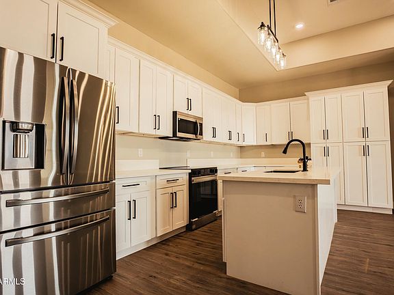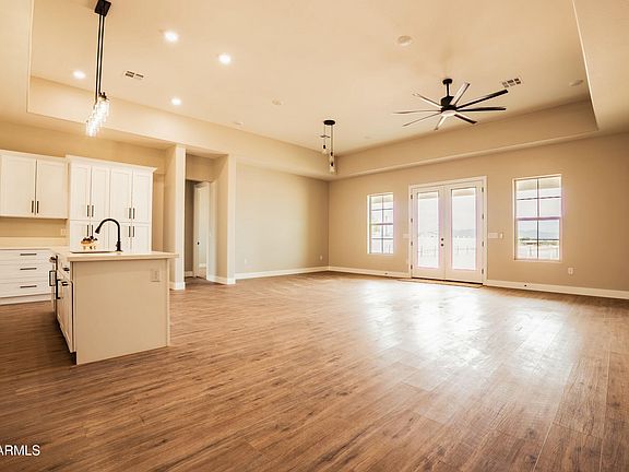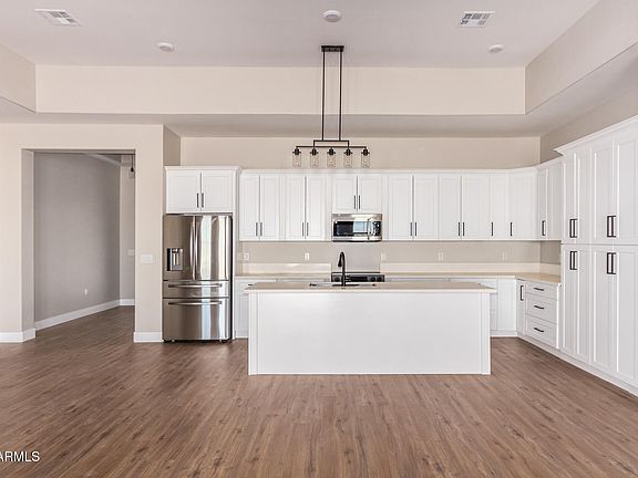 Be excited to see this newly built single-level residence in Buckeye with 2x6 construction! Step inside to discover the allure of the captivating open floor plan enhanced with 10ft plus ceilings and soothing paint tones complemented by wood-style flooring. The impeccable kitchen is outfitted with sleek stainless steel appliances, quartz counters, recessed and chic light fixtures, a plethora of white cabinetry with crown molding, and a sizable island with a breakfast bar. This gem provides well-appointed bedrooms, including two main retreats with plush carpeting, pristine ensuites, and walk-in closets. The home's elegance extends outdoors to the vast backyard with a covered patio, excellent for relaxation. The property is equipped with AC units that are upgraded to Trane Units. Very close to the proposed Goodyear's master planned community of Estrella, highway I-10, schools, shopping center, and the Goodyear Airport. It has lots of potential.