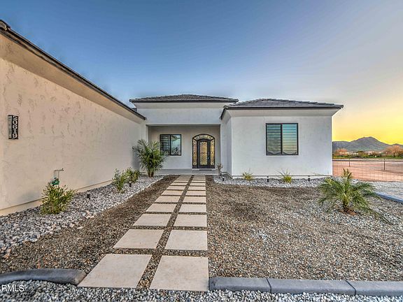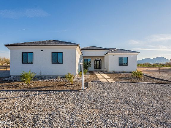 Luxurious custom new build in Buckeye! Welcoming tiled entry with wrought iron doors, open concept living area that has a built in entertainment center w/electric fireplace. Built in bar with wine rack and mini fridge. Kitchen offers high grade maple wood soft closing cabinets, gorgeous quartz counters, stainless steel appliances and a coffee station. Junior suite has private exit to backyard, barn door that leads to bathroom that includes dual flush water saving toilet, tiled shower with rain shower head, and a spacious walk in closet.Two additional guest bedrooms with a shared full guest bathroom. Master suite also has a private exit to the backyard, en suite bathroom that includes dual flush water saving toilet, tiled shower with rain shower head, and a spacious walk in closet.Laundry room with sink and storage. 10' ceilings, custom lighting, and filtering dual shade blinds throughout! Large three car garage with double electric openers and epoxy floors. All windows have exterior black trim and screens. Covered back patio with tiled flooring. Come get the best of both worlds in this amazing home. Luxury country living at its finest! Seller is open to concessions.