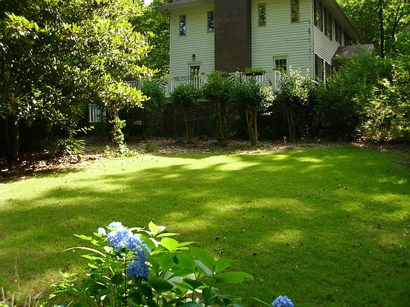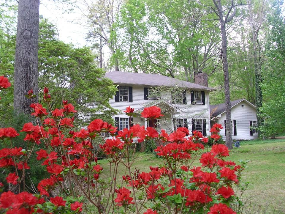 Beautiful, two-story Georgian-style home in private setting on 4.86 wooded acres at the base of Chimney Peak mountain. This 3,137 sq. ft. home includes three bedrooms, two baths and large rec room in converted garage which can also be used as fourth bedroom. Upstairs bath has walk-in shower, large tub and double sinks with adjoining guest sink. Home includes spacious living room, study/library with built-in shelves, two wood-burning fireplaces with lovely mantles, updated kitchen with new counter tops, and dining room with creek view. All rooms have beautiful crown molding. Floors include new hardwood and beautiful tile. Enjoy your meals while watching the wildlife through the double glass doors overlooking the babbling brook in the backyard. Beautiful creek with wooden bridge behind the house and shed. Property includes many dogwood trees and fruit trees including peach, pear, apricot and fig. Honeysuckle, jasmine, and sweet olive bushes perfume the yard and large deck. Enjoy the privacy of country living, while being within ten minutes of shopping areas and schools. Snap up this lovely home soon and it will save the added cost of real estate brokers.