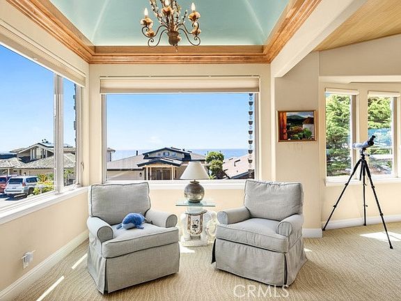 Nestled in the heart of Cambria's Marine Terrace, this extraordinary custom beach residence stands as a masterpiece of coastal elegance. Meticulously crafted in 2008 and thoughtfully enhanced with bespoke details, the home showcases a harmonious fusion of natural elements, featuring exquisite bamboo and stone flooring. Step through the double doors where the foyer welcomes you. The open floorplan has been thoughtfully designed to seamlessly blend natural light and custom elements, creating an ideal setting for both entertainment and relaxation. The first level boasts two spacious bedrooms, a den with a sliding door opening to the lanai and offering a additional approximate 374 square feet, and a conveniently placed laundry area. The grand staircase leads to the second level and the open floorplan that immediately surrounds you with breathtaking views. This level features a gourmet kitchen with a beautiful island, seamlessly flowing into a dining area and a living room adorned with a cozy fireplace. An adjacent patio creates a perfect space for indoor-outdoor entertaining. An office with its private patio and the luxurious owner's suite complete this level. The home features a street-to-street lot with a two-car garage and a convenient outdoor shower, perfect for post-beach cleanups. With its beautiful coastal views, the residence is tastefully appointed, seamlessly combining practicality and charm. Additionally, the property is equipped with an elevator, offering effortless access to both levels of the home as needed.