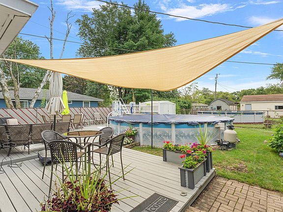Welcome to this charming ranch home with lovely landscaping and a fenced backyard that you'll enjoy spending time in. The deck area is perfect for relaxing, grilling, or just lounging by the 24ft heated pool. There's a gas line for your grill so you never have to worry about running out. Step inside to the 3 Seasons room with Eze-Breeze porch enclosures, making it a peaceful and enjoyable space all year round. The main level features beautiful flooring throughout, an expansive kitchen with ample cabinets, pull-out shelving, and an island overlooking the spacious dining area with a large sliding window. The living room is cozy with a gas fireplace and another large sliding window to bring in plenty of natural light. The finished basement offers extra space with brand new luxury vinyl flooring, serving as a 2nd living room, game area, office, and dining area. There's a full bathroom with a walk-in shower, two additional rooms - one with a walk-in closet and the other can be used as an office or flex space. The insulated 2-car garage is heated with a built in workbench and 3 steel shelving above it, and a plug for a generator. There are also 2 sheds to provide even more storage. Situated in a quiet cul-de-sac and close to highways, making it convenient for commuters.