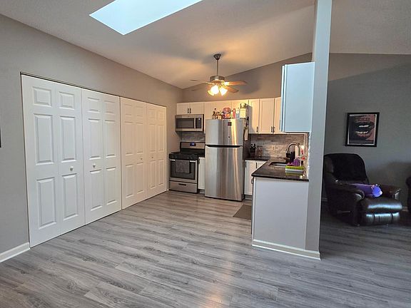The spacious primary bedroom provides plenty of room to relax and unwind, while the second bedroom offers versatility as a guest space, office, or hobby room. The kitchen is a true highlight, featuring stainless steel appliances and a beautiful skylight that fills the space with warmth and daylight.