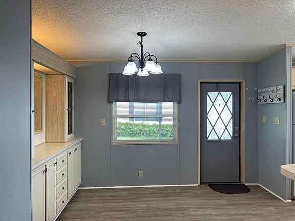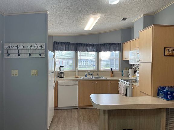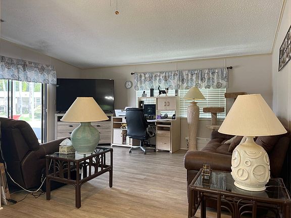 Welcome to this quaint, cottage-like 1990 Palm Harbor, which offers 2 bedrooms, 2 bathrooms and an easy-to-maintain 1090 sq ft of living space. Updates include Thermopane windows, laminate flooring, and tile backsplash with updated appliances like the above-range microwave and snack counter in the galley-style kitchen. Both the guest and master baths showcase nice linoleum that looks like tile. The laundry room is located out of the way in an interior closet. Outside on the roomy lanai, which is situated on a wooded lot, you'll find roll-away blinds for added privacy. The home is being offered partially furnished with the golf cart! Contact Cypress Lakes Sales & Information for more information and showing requests.