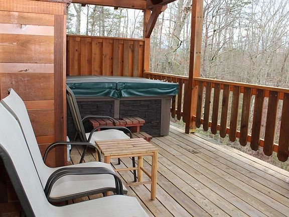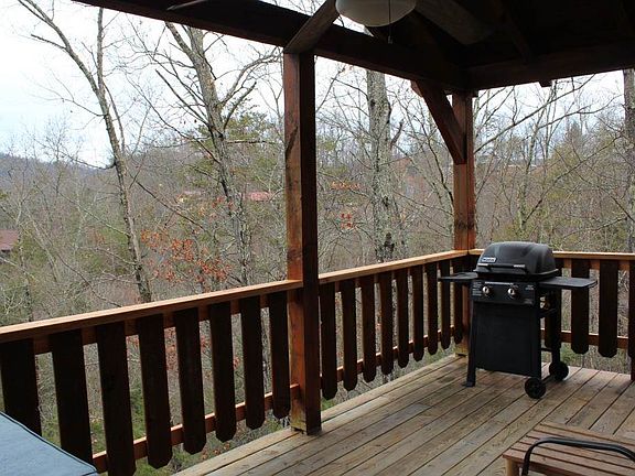 Private two bedroom cabin on 1.05 gently sloping acres in a serene Smoky Mountain setting. Located roughly 10 minutes from downtown Pigeon Forge and 15 minutes from Gatlinburg There are two rear decks to enjoy the great outdoors with hot tub, chairs and propane gas grill. The cabin has a fully equipped kitchen, living room with gas fireplace, game room, and cathedral ceilings. Two enclosed bedrooms with full baths. Lower level master bedroom has whirlpool tub and door to deck. Lower level rec room with bumper pool table and air hockey.