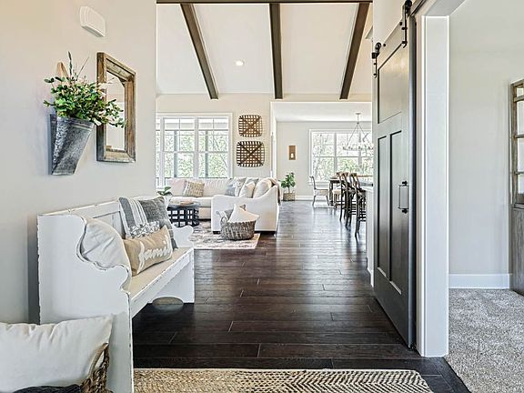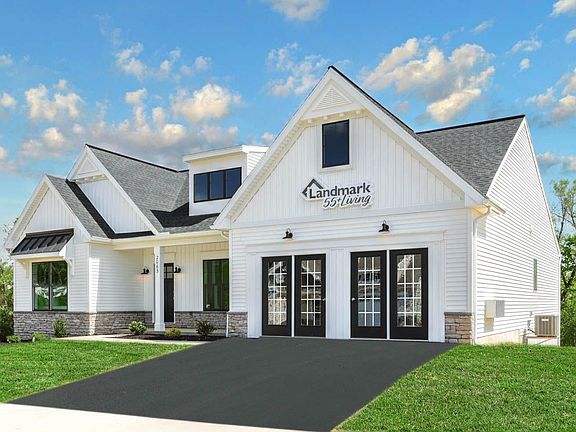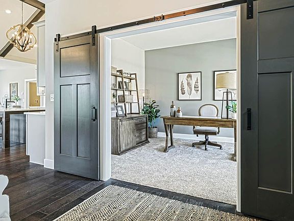 This 1-story model home at Cortland Park 55+ Living features a welcoming front porch and stylish exterior finishes.. To the front of the home is the study with sliding barn door access. Beautiful hardwood flooring in the foyer extends to the kitchen, family room, and dining area. The kitchen and family room share a cathedral ceiling accented by wood beam detail. The open kitchen is well-appointed with slate appliances, Hanstone quartz countertops with tile backsplash, and attractive cabinetry with decorative crown molding. A cozy gas fireplace with floor-to-ceiling stone surround warms the family room, and a sliding glass door off of the dining area leads to the screened-in porch. The owner's suite, tucked to the back of the home, features a tray ceiling and craftsman style wainscoting accent wall in the bedroom and a private bathroom with expansive closet with custom shelving, tile shower, and double bowl vanity with quartz countertops.