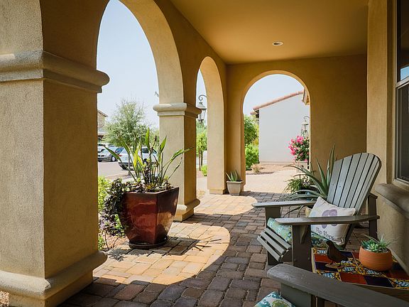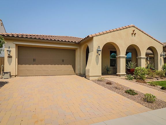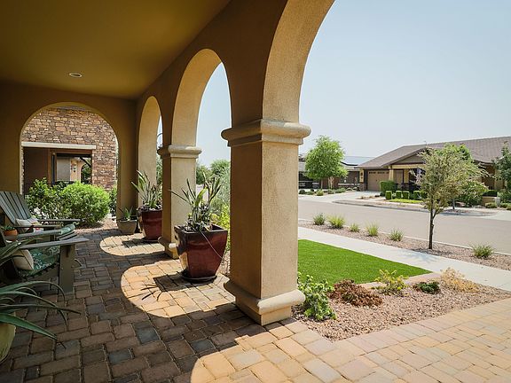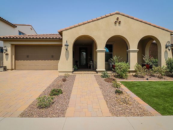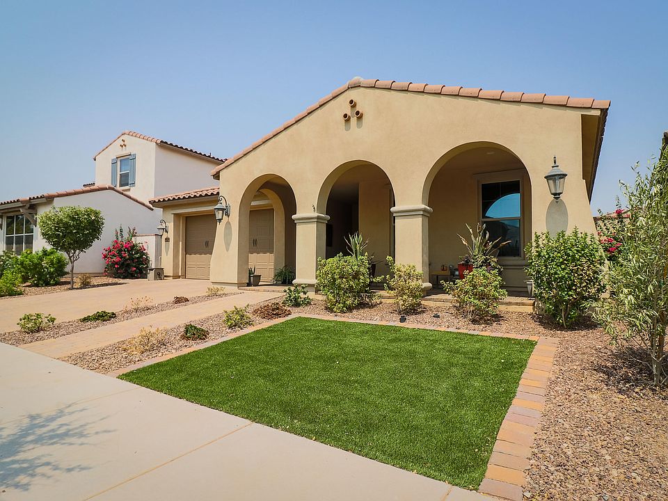 2x6 construction lends to a VERY energy efficient home. A real front porch, complete with elegant pavers and arches overlooks a manicured yard. Beautiful touches extend into the indoor spaces as well. The kitchen's warm wood cabinets offset the gleaming stainless steel appliances and classic subway tile backsplash. A large island overlooks a spacious dining room and family room, well lit by numerous windows. The bedrooms all have large closets and ceiling fans. The master bathroom is spa-like with its oil rubbed bronze fixtures, a separate tub and double vanities. This home boasts extras like a roomy pantry, large laundry room, sewing nook, and gorgeous covered back patio. This Verrado home has access to the pools, parks and rec centers. Verrado amenities just keep on giving.