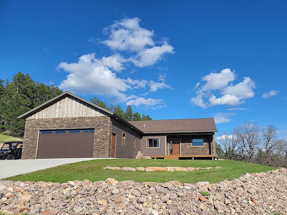 Located on the beautiful 18-hole Boulder Canyon Golf Course, this newly constructed (2020) home is set against the Black Hills National Forest with amazing views of the golf course and surrounding hills. All roads are paved and the utilities are underground to keep the view pristine. Located in between Deadwood and Sturgis, with a 10 minute drive to either and walking, hiking, UTV trails, motorcycle riding, and golfing all within seconds. This custom, one-level home has an open concept for plentiful entertaining space inside or outside on the large, covered patio area. With 9 foot walls throughout and a vaulted ceiling in the great room, this 1,838 sq foot home has the feel of a larger home, but with less to clean and maintain. The oversized master bedroom has a walk-in closet and spacious bathroom with a walk-in tiled shower. Other rooms include a guest bedroom, a full bath, and another bonus room to be used as an office/den or another spare bedroom. The kitchen is full of storage space and features a 30 sq foot island and beautiful granite countertops. Luxury vinyl plank flooring throughout is top-of-the-line with a 30 mil wear to be extremely long lasting, is incredibly easy to maintain and clean, while being comfortable to walk on and is pet friendly. Natural gas stove/oven, clothes dryer, on-demand water heater, furnace, and fireplace keep your utility bills low, and we’ve ran a line to the patio so your grill will never run out of gas mid-grill. The 900 sq foot garage has over 11 foot side walls leaving so much room for storage and all of your necessary toys.
