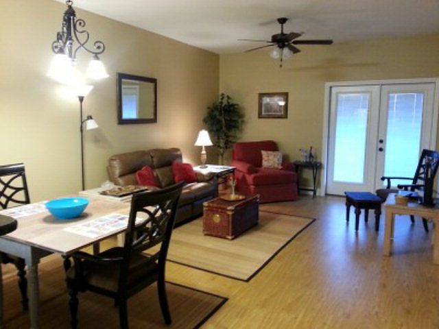 Deluxe 3-bedroom, 2-bath condo on second floor. Spacious floor plan with Pergo wood floors, tile and carpet. Granite countertops throughout. Stainless Steel appliances. Hop-up bar with a small breakfast/dining area overlooking the living area. Split floor plan with large master bedroom with walk-in closet off master bath. Laundry room. Faux wood blinds on all windows. Covered deck. Gated pool.