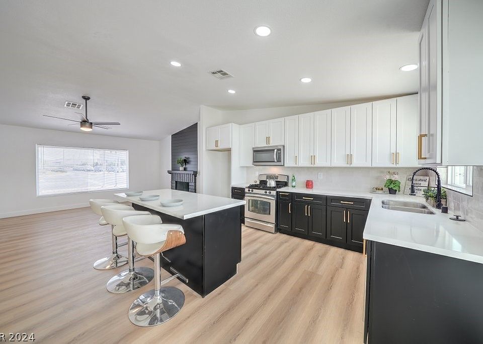 Welcome to this fully upgraded 3-bedroom, 2-bathroom property that perfectly blends modern style and comfort. The kitchen features stunning quartz countertops, stainless steel appliances, and elegant black & white shaker cabinets with soft-closing technology. The house boasts 5-inch baseboards, is freshly painted, and has durable vinyl flooring (LVP) throughout. Our remodeled bathrooms showcase new custom tile showers, adding a touch of luxury. Enjoy the spaciousness provided by high ceilings and an open floor plan, complete with a cozy fireplace. The good-sized bedrooms and a great-sized lot offer plenty of space for relaxation and activities. New double-glazed windows ensure energy efficiency and a quiet interior. This home is a must-see!