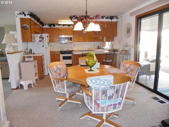 Open plan, 1305 sq ft, with 2 bed, 2 bath, 2 car garage in The Estates in Woodburn, an active 55+ community. Large rooms. Modern finishes. Lovely area. Kitchen w/eating bar. Gas fireplace in living room. Hot tub on covered patio. Inside utility. Newer siding & roof. 18 hole golf course, pool, spa, exercise, RV storage, meeting/activity areas. Tons of activities. Ready for new owners!