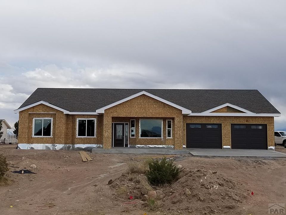 Don't miss this new build in an excellent location with awesome views of Pikes Peak and the mountains! This home is situated on 1.38 acre and is in A-3 zoning which allows for horses. This home has all you need with three bedrooms, 2 baths and a den/office with one level living. Decorative stamped concrete greets you as you approach the covered porch and beautiful glass front door with side panels which allow for plenty of natural light in the living room. The living room has vaulted ceilings and a fireplace as well as excellent views of Pikes Peak. The open concept allows for free-flowing space between the living room and kitchen while also offering a dedicated dining area. The kitchen will have a stainless-steel appliance package, granite counter tops and a generous sized island and plenty of cabinet space as well as a pantry. The dining area has immediate access to a covered patio with stamped concrete accents offering a nice space for outdoor dining and relaxation. Both master bath and main bath will have granite counter tops. Wide hallways and doorways make this home easily accessible for any buyer. The over sized two-car garage rounds out this home and even has an added area specifically for additional storage or tools etc. Estimated completion in mid-June.