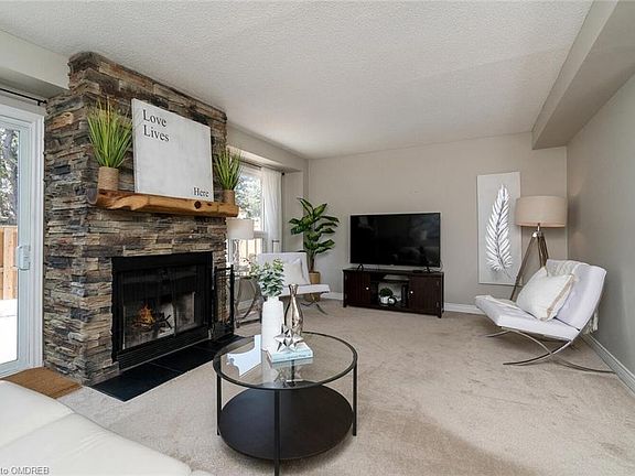 Located in the family friendly neighbourhood of Mountainside, we present this updated 3 bed, 3 bath, 1,417 sq ft condo townhouse. From the second you enter the bright front entrance with double door closet, you are welcomed by a spacious open plan. Beginning with the kitchen, rich cabinets line this chef's dream. You have a large space to move around with tons of counter space and storage. The beautiful dining space is the perfect gathering spot for intimate meals while the living room with stone wood burning fireplace focal point adds sophistication and warmth. The spacious master bedroom retreat is complemented by a unique dressing table area that separates the spa-like 3-pc ensuite on one side, and a walk-in closet with tons of organizers on the other. Everything you need in your very own personal getaway! The second and third bedrooms are bright and spacious with large feature window and ample closet space. Perfect as additional bedrooms, or as an office space. Each bedroom has been updated with rich laminate flooring while plush carpet lines the hallway and stairs. Moving to the basement, there is even more living space in the partially finished area. Enough room for a large entertainment area and personal gym, you'll love this extra space. The remaining unfinished space offers plenty of storage space as well as your basement laundry area. And finally, the stone patio in the backyard is the perfect low maintenance getaway. Enough room for a patio table set for summer BBQ's or an intimate seating area, you've got the perfect space for sun and relaxation!
