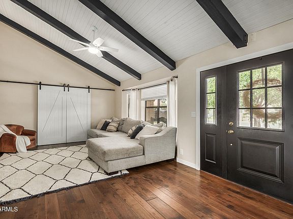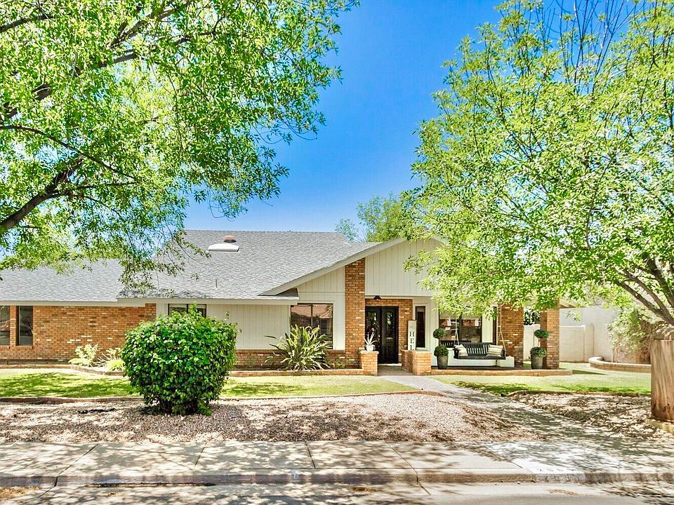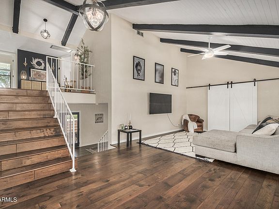 Gorgeous corner lot residence featuring an impeccably-manicured and mature landscape in Mesa is the one you've been waiting for! This majestic property combines a serene ambiance & an elegant living experience in perfect harmony. Captivating interior boasts gleaming hardwood floors, high-vaulted ceilings adorned with exposed beams, designer palette, & dazzling light fixtures. You'll also find a charming fireplace in the family room, ensuring an inviting space for your gatherings. The stunning chef's kitchen showcases SS appliances, leathered quartzite counters, stylish tile backsplash, wall oven, a walk-in pantry, built-in desk, & an island complete with a breakfast bar. Main retreat offers an impeccable ensuite bathroom. The backyard is an entertainer's dream with large diving pool, covered patio and turf for easy maintenance.