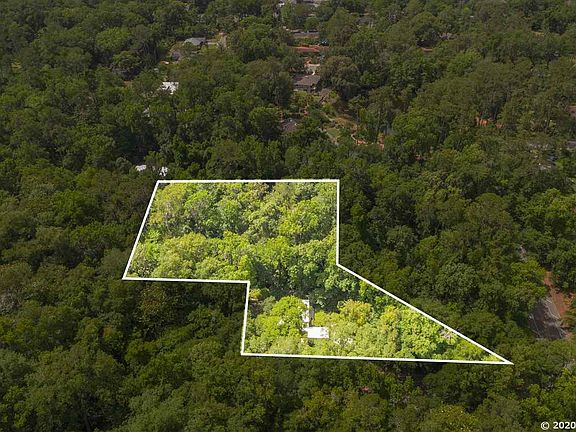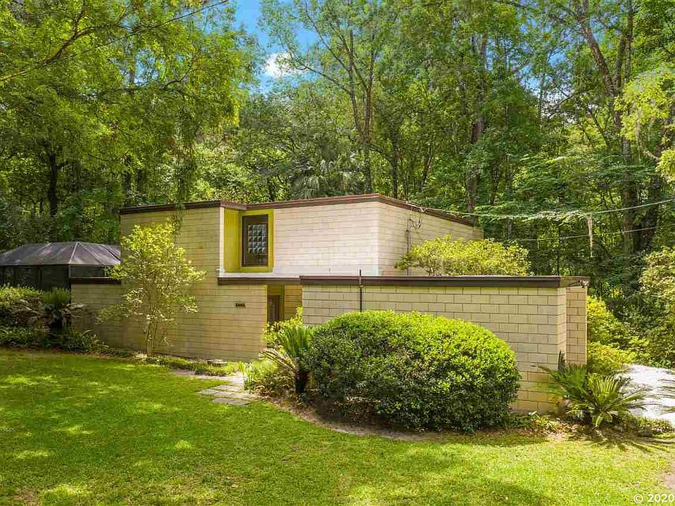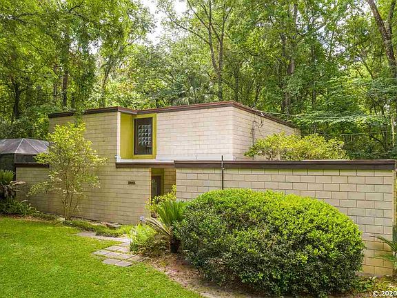 Unique Mid-century modern pool home on large 1.37 acre lot. This architectural gem is a one of a kind with extensive windows and sliding doors opening up to marvelous screened bricked two story lanai with hot tub. You will fall in love with views of the creek and lush vegetation. There are multiple balconies to take in this true tropical oasis. Home has 3 bedrooms and two updated baths with modern electric toilets. Galley kitchen has corian counter tops and eat in bar. Dining area boast natural light from skylight. A four sided wood burning fireplace separates dining area from family room. Following the geometrical theme relax in separate screened pool area with outdoor shower. Three large closets in carport allow for ample storage. Walk or bike to UF and Ben Hill Griffin Stadium. Minutes away from Midtown and Downtown dining and shopping. Must see....a true gem!