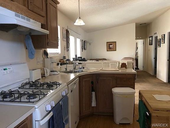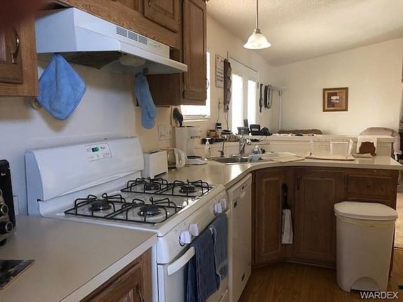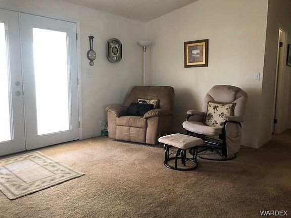 Extremely clean and beloved manufactured home, located on leased land at Santiago Villa, in Fort Mohave. This home features two beds, two baths, a den, and dining area. Floor is like new, new blinds, a new AC in 2018, water heater replaced in 2018, and with the right offer can come with furniture. It also has features that make this lot stand out, it is ground set, has two driveways, one with a 56 foot long car port and the other side has a single car attached garage! Exterior walls are 2 x 6 so are insulated well and made to last. Backyard has a small fenced in pet area and a storage shed. Near the community pool and mailboxes!