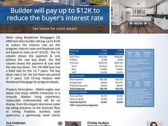 Check OUT this AMAZING opportunity to get a PRE-INFLATION INTEREST RATE on this BRAND NEW CONSTRUCTION HOME saving you HUNDREDS in monthly PAYMENT!!! Watch eagles soar above and enjoy wildlife immersion in a uniquely Alaskan living experience. Impeccable craftsmanship will be on display, from the elegant decorative cedar lap siding entrance, to the dramatic floor to ceiling fireplace, stainless...steel appliances, a generously sized island, shaker style soft closing doors and drawers, under cabinet lighting and a kitchen worthy of a professional chef. The primary suite features a garden-style tub, dual quartz vanity, separate shower, expansive double walk-in closets. Home boasts four generously sized bedrooms plus a loft/flex area and a separate dedicated office area. Oversized 1126 square foot 3 car garage. Room for an extensive RV parking pad. Area amenities provide easy access to hiking trails, Menard Center and neighborhood park. Builder to contribute towards Buyers Interest rate buy down of up to $11,761 (based on 5% down)