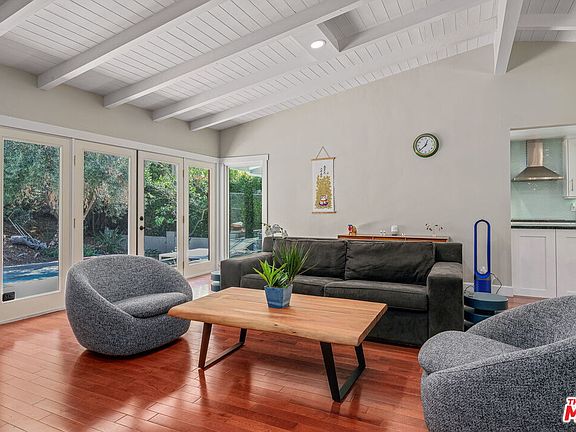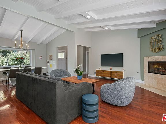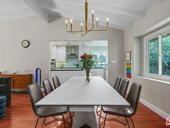 Perched in the hills of Bel Air, this private, 3-bedroom home is tucked away from the street amid the lush landscape. Featuring a beautifully open and airy layout accented with abundant natural light, the home opens to a living room complete with beamed vaulted ceilings, hardwood floors and a cozy fireplace. Here, glass sliding doors provide access to a large patio ideal for barbecues, entertaining and basking in the California sunshine. The bright kitchen offers large windows that flaunt views of the surrounding greenery along with premier appliances, stone counters and tile backsplash. Flowing through the dining room, a hallway leads to two secondary bedrooms and the sunlit primary suite with vaulted ceilings, walk-in closet and spa-bath with separate tub and glass enclosed shower. With access to all of LA's premier shops, dining and entertainment, yet a seeming world away, this private Bel Air retreat offers the best of California living.