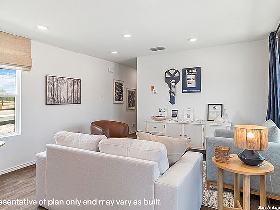 Introducing The Wyeth, a beautiful floor plan featured in the Sonora new construction home community in San Antonio, TX. This thoughtfully designed single-story home offers 1023 square feet of living space, with 3 bedrooms and 2 bathrooms, making it the perfect option for families or those looking. The home's exterior is available in two elevation options, both featuring durable James Hardie siding for long-lasting beauty, for a cozy, yet spacious home. The Wyeth replaces a traditional garage with a driveway, providing convenient parking and easy access. The open and blended layout combines the living room, dining area, and kitchen, creating a seamless space for both everyday living and entertaining. The kitchen is a true highlight, featuring modern shaker-style cabinets, sleek stainless steel appliances, and elegant quartz countertops. A corner pantry provides added storage space, making it easy to keep everything organized and within reach. The main bedroom suite is thoughtfully located toward the front of the house for added privacy and comfort. It includes plush carpet flooring, a walk-in closet, and an ensuite bathroom with a single vanity quartz sink, a walk-in shower, and modern finishes. The secondary bedrooms are spacious and feature carpet flooring, large windows that allow natural light to fill the rooms, and closets for storage. Additional features of The Wyeth include quartz countertops in the secondary bathroom and hard surface flooring throughout the living room, dining area, kitchen, and wet areas, ensuring easy maintenance and a modern aesthetic. With its open concept design, stylish finishes, and well-thought-out layout, The Wyeth is the ideal home for those seeking both comfort and modern living at Sonora in San Antonio, TX.