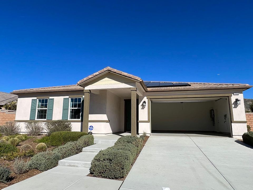 Must see! Located in the highly desirable Spring Mountain Ranch community of Riverside; This brand new upgraded modern farmhouse-inspired model home is situated on a 9,408 sq ft lot and offers 4 bedrooms and 2 full baths with an open concept layout. The home has tile and carpet throughout! Kitchen appliances are all top-of-the-line stainless steel appliances, a walk-in pantry, ecobee thermostats, and a tankless water heater. The backyard has been landscaped, a huge concrete patio spanning the width of the house with tons of yard space! Enjoy the wonderful mountain view in the backyard. The home has solar panels to provide savings. The Spring Mountain Ranch community offers multiple walking/hiking trails and 2 parks inside the community. Renter responsible for water, sewer, trash, gas, and electricity. Last month's rent due at signing. No smoking allowed.