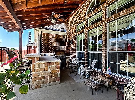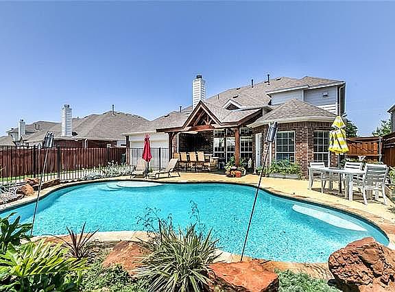 This home with a backyard paradise is a must see. The large covered patio with ceiling fans, built in kitchen w/ seating bar and grill overlook the inviting pool. The stacked living and dining areas have wood flooring, decorative picture frame molding and arches. The kitchen has granite counter tops, stainless steel appliances, gas cook top, butler's pantry and bright nook with views of the pool. The family room is large with wood flooring and two story ceiling. The large private study has double doors. Upstairs includes a game room and secondary bedrooms with walk in closet. The wonderful community has a pool, clubhouse, work out center and parks.