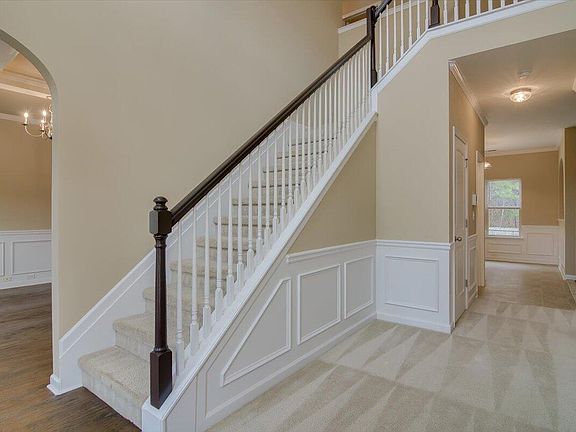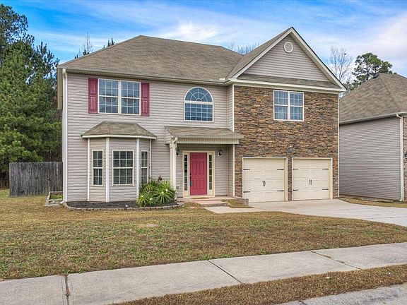 Low maintenance two story vinyl and stone siding 4 bed 2 ½ bath home located seconds from Fort Eisenhower's Gate One (and VA loan is assumable)! Spacious front foyer with two story ceiling entry way and wood banister open staircase! Dining room boasts coffer ceilings with oversized painted beams, bay window, and hardwood floors with waist high wainscoting! Massive eat in kitchen with island, open concept design, and oversized voluminous cherry cabinetry. All kitchen appliances stay! Sunken living room just off the kitchen is huge and includes fireplace. Upstairs you will find all four bedrooms, hall bath, laundry, and oversized owners suite. Back yard includes poured open patio, is fully fenced in, and backs up to beautiful mature pine trees, giving the yard a private secluded feel! Minutes from everything Grovetown and Augusta! Centrally located near the intersection of Belair Rd/Jimmy Dyess Parkway/Highway 78 and close to the new Kroger grocery store opening in 2024, Zaxby's, Starbucks, McAlister's, Wal-Mart, Chick-Fil-A, the Augusta Mall and so much more; all just minutes away! Come see why you should make this house your ''home''!