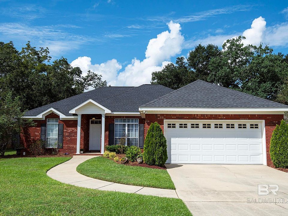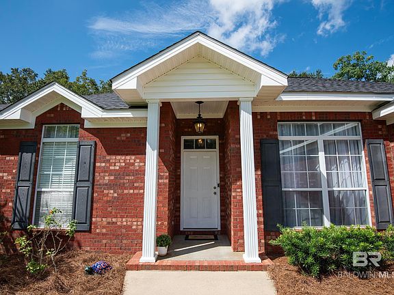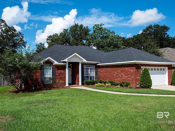 Move-in ready, custom built, brick home located minutes from downtown Fairhope, shopping & beaches. Spacious 3 bedroom 2 bath, split bedroom plan home is light & airy. Boasts NO CARPET; vinyl plank and tile throughout, high ceilings, formal dining room, large living room with an electric fireplace. Primary bedroom has plenty of room for a sitting area. Ensuite bathroom includes double vanity, garden tub, separate shower, private water closet & roomy walk-in closet. Kitchen features stained cabinets & breakfast bar. Beautiful crown molding is found throughout the home. 2 car garage with attic storage & wall cabinets for extra storage. Large fenced in backyard has a covered patio & is perfect for entertaining or just relaxing. Enjoy reading a book while sitting by the neighborhood pond. Seller will provide Home Warranty. Buyer to verify all information during due diligence.