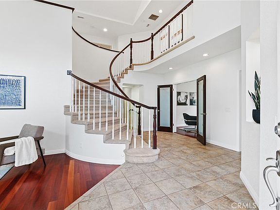 This one-of-a-kind Trabuco Highlands home in Robinson Ranch has so much to offer. The home has a potential of 7 bedrooms, 4 bathrooms, and with over 4000 sq ft, has room for everyone to stretch out and be comfortable. When you walk in you are greeted with tall ceilings above a beautiful living room, downstairs office, and gorgeous winding staircase. Around the corner is the huge kitchen with large island, walk in pantry, two Bosch dishwashers, two stainless steel refrigerators, beverage refrigerator, Thermador 6-burner gas range, electric wall oven, microwave, and reverse-osmosis water system and is open to large family room with stack-stone wood-burning fireplace, 5.1 surround-sound and large game area for pool table or whatever you wish. There is also a large flex room with gas-log-fireplace, 5.1 surround sound, built-in cabinets, drawers, and desk and can be used as downstairs bedroom ensuite. Upstairs you will find the spacious primary bedroom, with beautiful Travertine double shower, dual vanity, and 3 closet spaces. Also upstairs is a loft space, another office or bedroom with own split-system a/c, 3 other bedrooms, or use as game room, teen space, or craft room. The backyard features a beautiful stone saltwater pool and spa with waterfall and built-in BBQ on patio. The home also features Brazilian Cherrywood floors in living, family room, loft, and offices, recessed lighting, ceiling fans in bedrooms and office, remote-operated shades in primary and upstairs office, separate laundry room, tankless water heater for primary, main-floor bedroom bath & kitchen, & gas water heater for the rest of the house, EcoBee smart thermostats for 2 separate-zoned HVAC systems, 2 whole-house fans, programmable garage door openers using MyQ app, outdoor cameras wired to Zosi system, as well as OWNED SOLAR (36 solar panels with 16kw array) with wireless monitoring, and so much storage. In addition to the 3-car garage with overhead storage racks, there are 3 attic spaces, a separate storage room, storage closet, linen closet, and linen cabinet. This versatile home has so many options for you to make it your own!