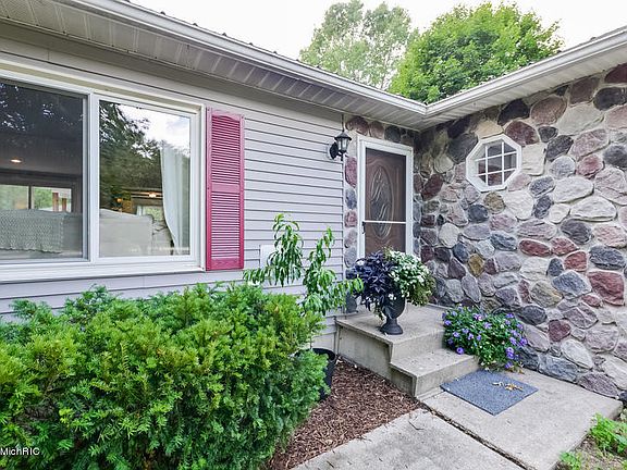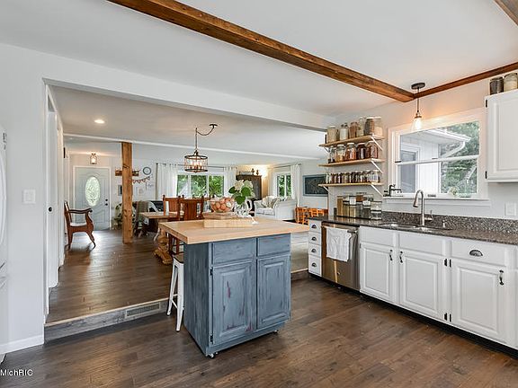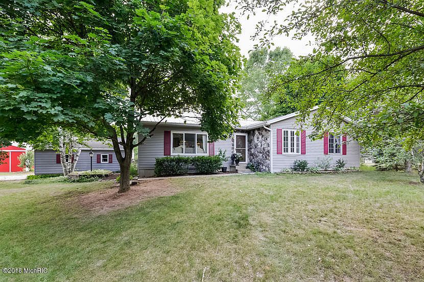 This captivating fully-remodeled home nestled amongst trees and gardens on nearly 7 acres (with more available), boasts a poolside oasis and nature sanctuary while being only 1.5 miles from 131 and 30 min from Grand Rapids. The open floor plan showcasing new handscraped hardwood floors is the toast of the 2442 SF, exuding the magical merging of being both cozy and spacious. The inviting kitchen, outfitted with solid surface counters and stainless appliances, makes entertaining effortless as it overlooks the expansive living and dining area. Sliding glass doors open to continue the sprawling space with the beckoning back deck and in-ground pool, enhanced by the enchanting gazebo and landscaping. A large garage and massive 32x40 pole barn with concrete floor expand outdoor ventures. The master suite is a delightful retreat to enjoy nature from as well, with ample room to unwind and a generous walk-in closet and skylight washing the luxurious master bath and jacuzzi in light.