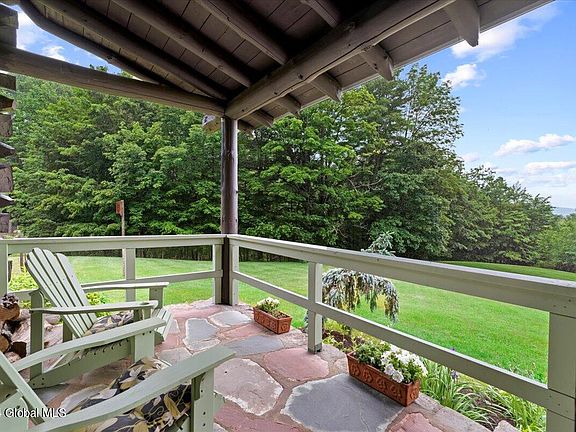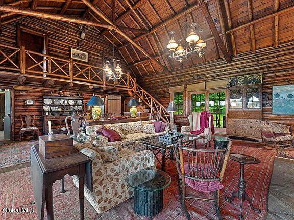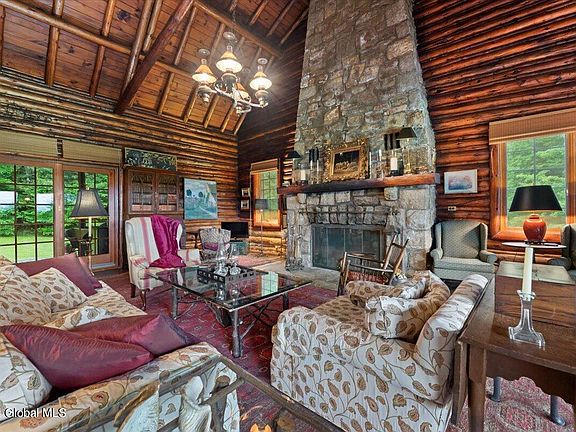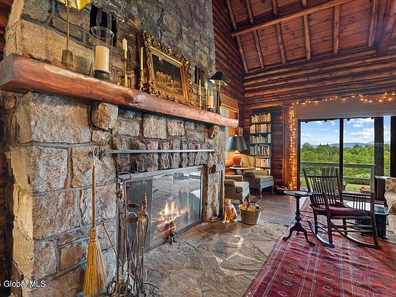 UNBELIEVEABLE OPPORTUNITY!! A uniquely built 5 BR, 2 BA log home sitting on 8 acres providing total privacy, mountain views and surrounded by beautiful gardens. Step into the bright & large great room with a floor to ceiling real stone fireplace. Log rafters, antique wrought iron and brass chandeliers flanked by sliding glass doors onto cozy open porches to view this beautiful property. Kitchen built with LEED practices of healthy & high efficiency: reclaimed barn wood cabinets, slate counters, and cork flooring. Solid custom staircase. Raised bed gardens and lots of hosta. Detached 2 car log garage with extra storage. In 2019 a new roof & Solar Panels that transfer with property and fully cover your electric costs, Generac generator and on demand hot water. Located close to everything.