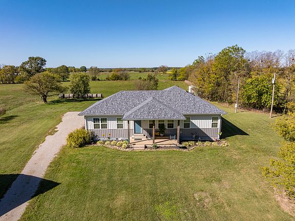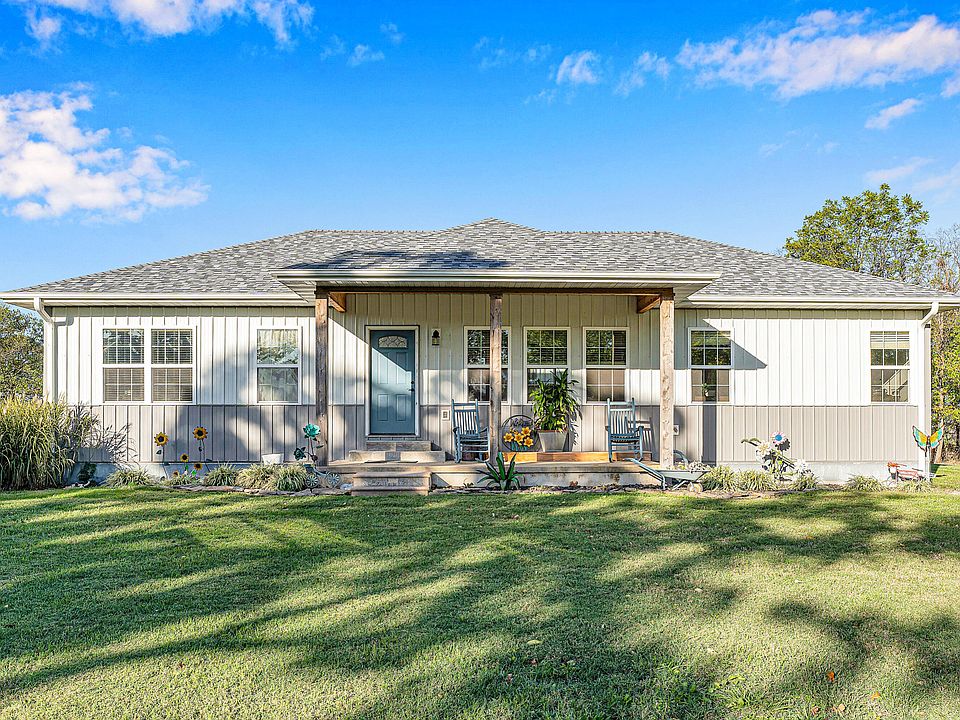Country Living Dreams are within your reach (and commute!) This sunny, open-plan home with over 3000 square feet is set on 12.5 acres and includes an impressive workshop and extra outbuildings! Situated among mature trees, the home was completed in 2022 with thoughtful selections of materials and finishes to create a timeless, peaceful oasis. You will love the split floorplan with primary bedroom, second bedroom, and the oh so sunny flex room on the main floor. The custom kitchen has a huge island, a pantry, and the-most-gorgeous granite. You will delight in the organization of the oversized laundry room that leads to the bright mudroom and then garage. Near the kitchen, the roomy primary bedroom has a luxurious adjoining bathroom complete with walk-in shower and modern tub. Downstairs, enjoy the radiant heated flooring in every room! You will love hanging out in the second living room, plus there are two more bedrooms - one with an adjoining half bathroom. There is also a convenient second stairwell that leads to the garage. Outside, there is plenty of space to entertain on the patio with beautiful views of the lush, level landscape. For the hobbyist, there is a huge 40x60 workshop that is very insulated and includes radiant heat floors as well! You will be impressed by the overhead door that will fit an RV and the car-sized paint booth. It is even plumbed for a bathroom if a transformation to a shouse and a family compound is part of your dream! Close by, you will find the oversized open machine shed, chicken house, and a vintage barn as well. New septic system installed in 2025 too! This property has everything you need to live out your destiny in the country! *20 min to Republic, 30-35 min to Springfield, Airport, or Table Rock*