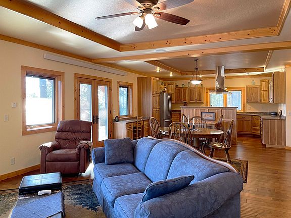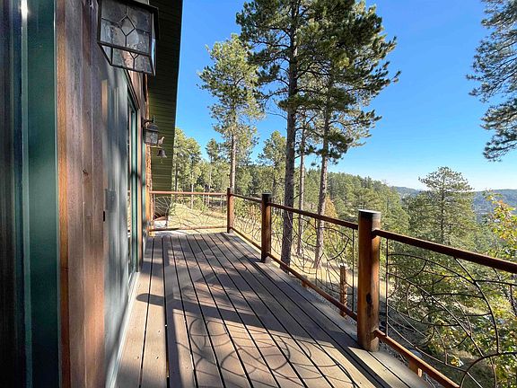 Spectacular Home nestled in the pines providing comfort and privacy with stunning views of Bear Butte, Apple Springs along Boulder Canyon and the beautiful Black Hills of South Dakota. The Custom home designed with meticulous care includes beautiful maple flooring throughout the upper level, vaulted ceiling, complete living area with kitchen, bedroom, and open deck to enjoy the outdoors. The main level includes hickory laminate flooring throughout, numerous warm wood tones, custom cabinets, built in matching dining table and office desk, a cedar closets with hideaway space, bay window, lovely gas fireplace, expansive master bedroom with built in drawers, pella windows and so much more!!! The large shop 30x40 is roomy with complete workspace including cabinetry, storage, shelving, and floor drains. The shop has permitable septic for bathroom addition. There is an upstairs finished bonus room for extra guests. The covered patio with log beams and expansive deck are great for entertaining or for peaceful enjoyment of the wildlife and views. Call Sandy Donahue with RE/Max In The Hills for your special viewing 605-645-7860