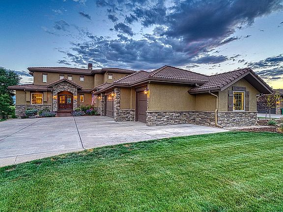 Spectacular custom home on the 5th hole in Flying Horse. Unobstructed Pikes Peak and Front Range views! Beautifully manicured 1/2 acre lot w/ mature trees, vegetable garden, stamped concrete walkways, and basketball court. Stucco and stone exterior w/ custom lighting and concrete tile roof. Large driveway for ample parking. Grand entrance w/ custom double solid wood doors into open floor plan. 20 ft ceilings, wide plank hardwoods, floor to ceiling stacked stone fireplace w/ rustic wood mantle, formal dining w/ coffered ceiling, sitting room, and loads of natural light. Amazing laundry/mud room w/ tile flooring, custom lockers made by brooks brothers. cabinets, and sink. Gourmet eat-in kitchen features subzero built-in fridge, professional grade 6 burner range w/ griddle, & dbl oven, granite counters, stone backsplash, custom trimmed hood, pendant lights, glass in-lay alder cabinets, butlers pantry, antique white cabinets on island, and large walk in pantry. Main level master suite w/ high ceilings and mountain views. Spa master bath boasts tile flooring, granite counters, large soaking garden tub, spa shower with rain head, and large walk in closet. The back deck patio is covered w/ stamped concrete floors, upper lighting, stone fireplace, & the best views imaginable. Upper level features open cat walk and three more bedrooms including a private en-suite. Incredible walkout basement w/ high ceilings, farm door slider, rec room, area for pool table, and large wet bar w/ granite counters, farmhouse pendant lighting, tile flooring, & fridge. Locked bourbon/wine or gun room. Custom Junior master or mother in law suite features private arched hallway, hobbit door, walk in closet, & large spa bath w/ walk in shower. Lower back patio is completely water proof w/ stained concrete floors, & sitting area. Dual climate heating/cooling. In ceiling speakers. Huge 3 car garage w/ loads of storage & attached custom wood shop! Truly one of the best lots in Colorado Springs.