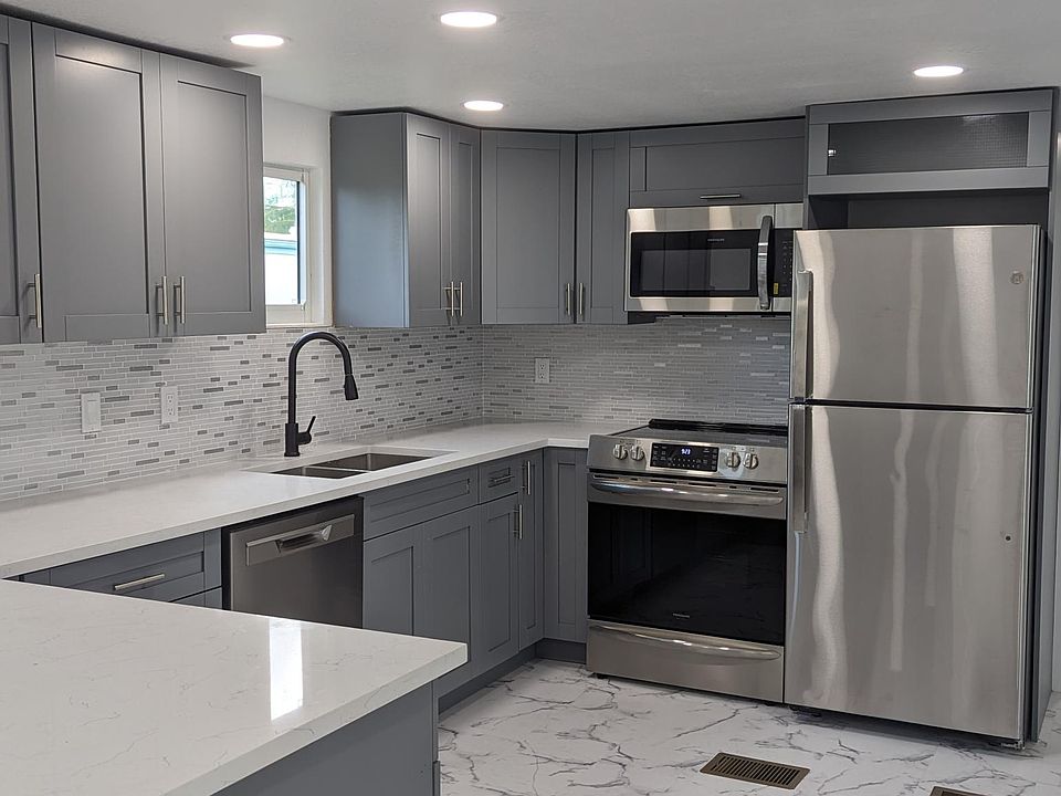 Newly updated and renovated Studio mobile home located in a 55+ community. Ideal for a single person. Brand new beautiful grey cabinetry, quartz countertops, Frigidaire appliances and all new tile floors throughout. Brand new A/C unit. Parking for 2 cars in driveway. Amazing amenities include pool, hot tub, fitness center, card room, billiard room and shuffle board. 2 minutes north of Mercato and 2 miles from Wiggins State Park Beaches. Water, trash pick up and lawn care included. Washer and Dryer included in unit with ample storage in a separate locked room. Must be at least 45 years old and able to pass a background check. Renter must be at least 45 years old and able to pass a background check. Located at 2069 Bougainvillea Ct., (Caribbean Naples Community) in Naples, FL. First month's rent and security deposit due upon signing lease agreement. Washer and Dryer in unit. Water, Garbage pick up and Lawn care included.
