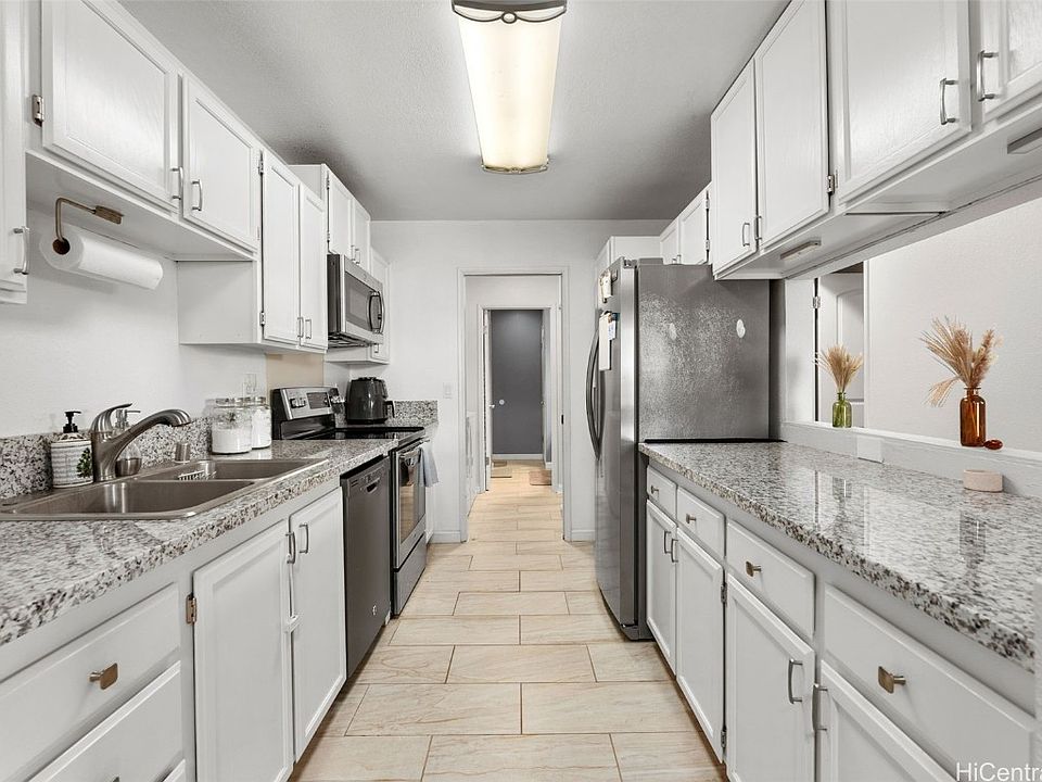 Discover the tranquility of Hidden Valley Estates as you step into this secluded ground floor, 2 bedroom/1 bathroom home within a single-story building, ensuring no neighbors above. Walking in, you'll be greeted by an open layout with newer flooring, a tastefully updated bathroom, and an upgraded kitchen featuring new countertops, appliances, and a unique pass-through to the living area. Access the lanai, where a custom deck extends over the lanai and opens to a grassy area with a playground. Additionally, the property boasts two designated parking stalls, with numerous guest stalls just steps away. The outdoor space surrounding the property is open and borders land preservation, providing a serene living environment. This property presents an excellent investment opportunity.