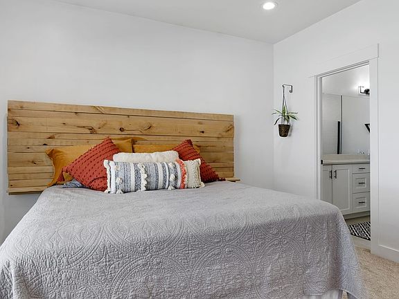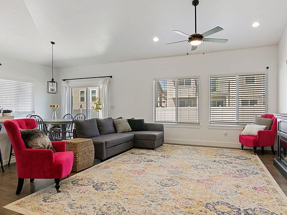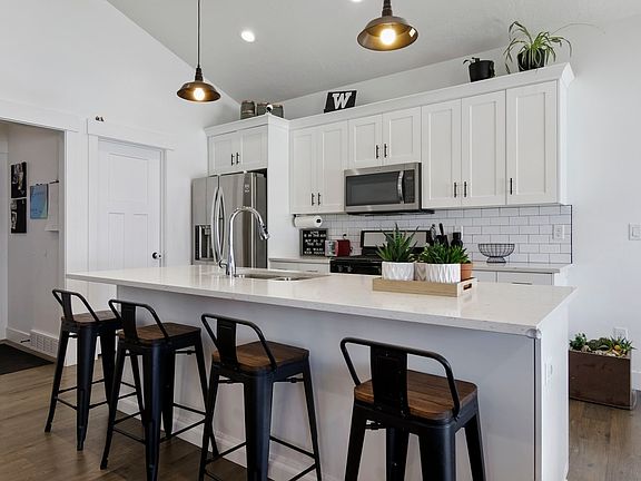 Beautiful Rambler with many upgrades including vaulted ceilings, quartz counter tops, white cabinets with back splash, large kitchen island, stainless steel appliances, and laminate flooring. There are large windows on the north side of the home that provide great natural light throughout the day. Backyard fenced in with fully landscaped yard. RV parking on the west side of house. Newer neighborhood with NO HOA FEES! Nearby parks, walking path and mountain bike trails!