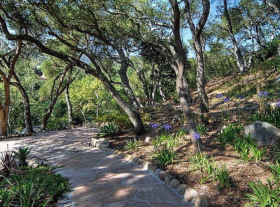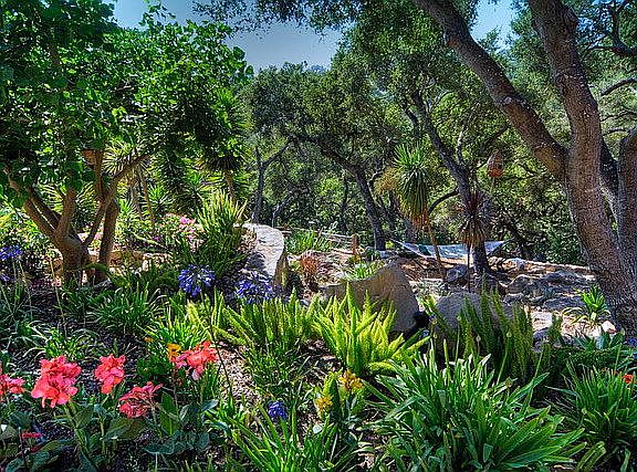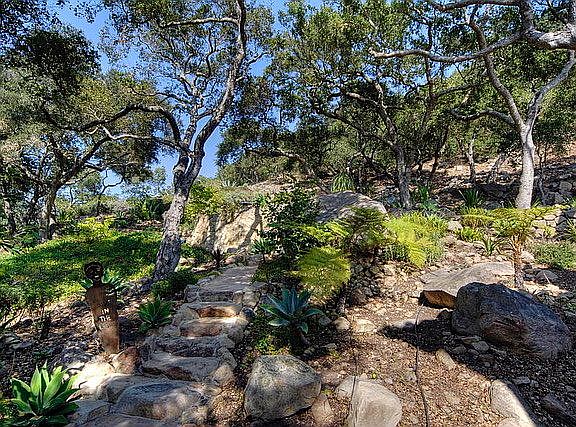 MEDITERRANEAN WONDERLAND A naturally landscaped wonderland surrounds this beautiful 4-bedroom, 4-bath Mediterranean home with legal detached guest house and 4-car garage. Custom windows and cabinetry are crafted from Honduran Mahogany. Enjoy expansive views from every room featuring mountain vistas and riparian oak setting. Large versatile rooms, high ceilings, skylights, and large kitchen with center island and breakfast bar make this residence the perfect spot for entertaining, relaxing, or meditating. Master suite and one bedroom are on main level for easy living, with two en-suite guest bedrooms on separate level adjacent to large family room/sitting room for guests to relax. Extensive storage with extra-large custom closets throughout the residence and the garages. Detached guest house features kitchen with top-line appliances, custom cabinetry, granite countertops, and hook-up for washer and dryer. You are assured of complete privacy on over 4 serene acres of your very own botanic gardens complete with meandering pathways, creeks, groves of oaks, secluded hot tub, intriguing vistas and sandstone boulders of every shape and size. Unique flagstone patios throughout the property provide the perfect venue for privacy and entertaining. A true one-of-a-kind Santa Barbara Shangri-La.