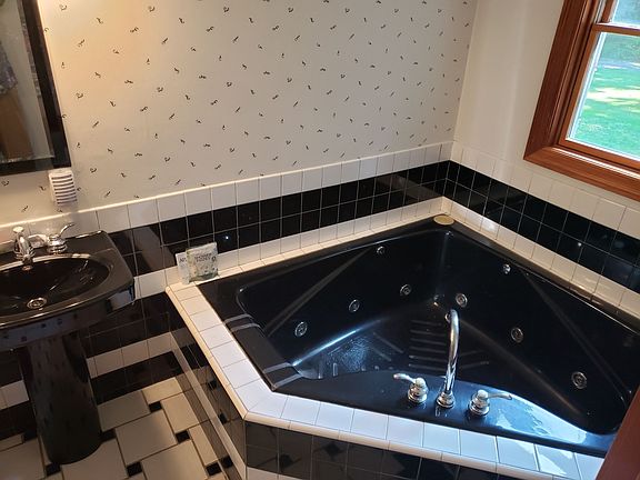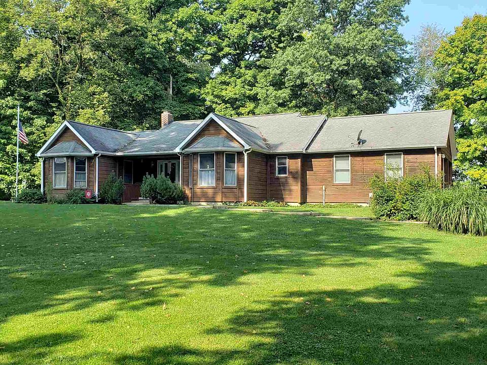 Lovely, freshly stained cedar sided home that is enveloped in a park like setting. You can walk through a small wooded area that has mowed trails or just sit on the wood deck and enjoy the peacefulness of the country. Beautiful living room with vaulted ceiling and wood burning fireplace. Cheery eat in kitchen has oak cabinets, tiled floor and all the appliances. New dishwasher was installed in June and new GFI's were just installed. Oak trim, 6 panel doors, pocket door, tile flooring and carpeting throughout this wonderful home. Skylights over the open sunroom bring in lots of light to the kitchen and living room. Master bath is stunning with the black and white tile, black tub and shower combo and a Jacuzzi tub. Garage has a concrete floor with a drain, work benches and extra cabinets. Crawl space access is in the garage.
