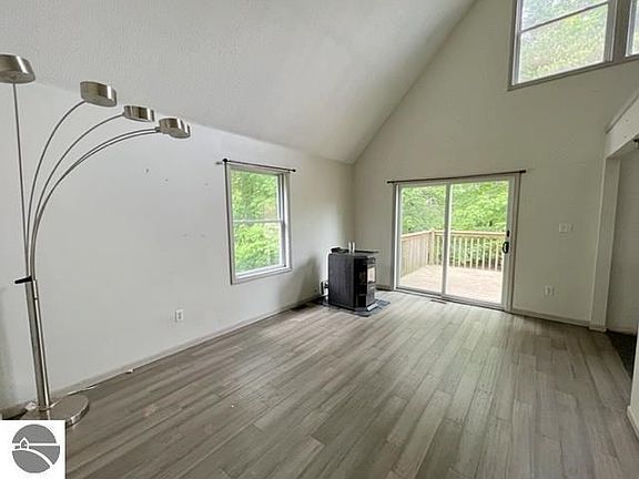 This 3 bedroom 1.5 bath home is situated on a beautifully wooded acre just outside of Cadillac. This home includes 2 bedrooms and a full bath on the main floor and a loft upstairs that is used as the primary bedroom with a half bath PLUS finished family room in the walkout basement. Awesome 32x48 pole barn with lean-to off the side for more storage or parking your toys! Great recreational area with Woodward Lake across the road and thousands of acres of state land just down the road. Buyer to verify all info.