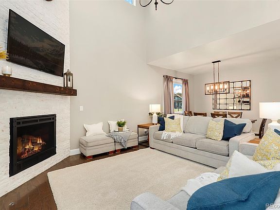 Perched atop a corner lot that backs to a green belt, this exquisite Hilltop Pines home has impeccable updates both inside and out! Fantastic curb appeal provides a great first impression thanks to mature landscaping, a well-maintained Craftsman-inspired exterior, and a charming front porch. Beautiful wood floors gleam throughout the interior and are enhanced by neutral paint, updated lighting, brilliant natural light, and 5-panel doors. Designed with entertaining in mind, the sweeping open concept floorplan is highlighted by a striking 2-floor vaulted ceiling and a recently added floor-to-ceiling stone fireplace surround. The stylish gourmet kitchen boasts lovely quartz countertops, a large island with seating, a classic subway tile backsplash, sleek black hardware, a walk-in pantry, and stainless steel appliances including double ovens and a gas cooktop. The main floor in completed by a mudroom that connects to the 3-car garage, a powder room, and a dedicated office with double door entry. All 3 bedrooms and the laundry room are conveniently located on the second floor. Two sunny secondary bedrooms share a full bath with double sinks atop a quartz countertop while the primary suite enjoys a vaulted cathedral ceiling, a walk-in closet, and a luxurious 5-piece bathroom complete with dual vanities and granite countertops. More living space awaits in the finished walk-out basement that offers an expansive family/rec room, another powder room, and a gym. The envy of the neighborhood, this home offers unbeatable indoor/outdoor living capability. An expanded deck is accessed off the breakfast nook via a sliding glass door and a sprawling covered patio connects to the basement family room and the fenced backyard. Additional upgrades include a Ring doorbell and security system, a Wi-Fi-enabled irrigation system, and tinted windows (extra thick on the ground level). Wonderful quiet location blocks away from miles of trails, a playground, and the outdoor community pool.