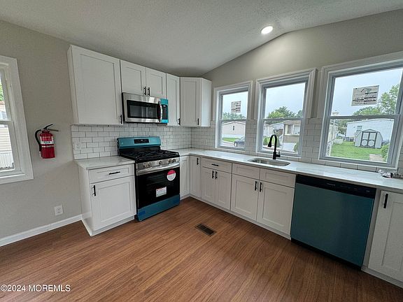 Step into this beautifully updated 2-bedroom, 2-bathroom mobile home, designed with modern elegance and comfort in mind. The expanded eat-in kitchen is a standout feature, boasting vaulted ceilings, and an abundance of white shaker cabinets. The sleek white and gray quartz countertops, paired with brand new stainless steel appliances, offer both style and functionality. Throughout the home, you'll find stunning new neutral waterproof laminate flooring.