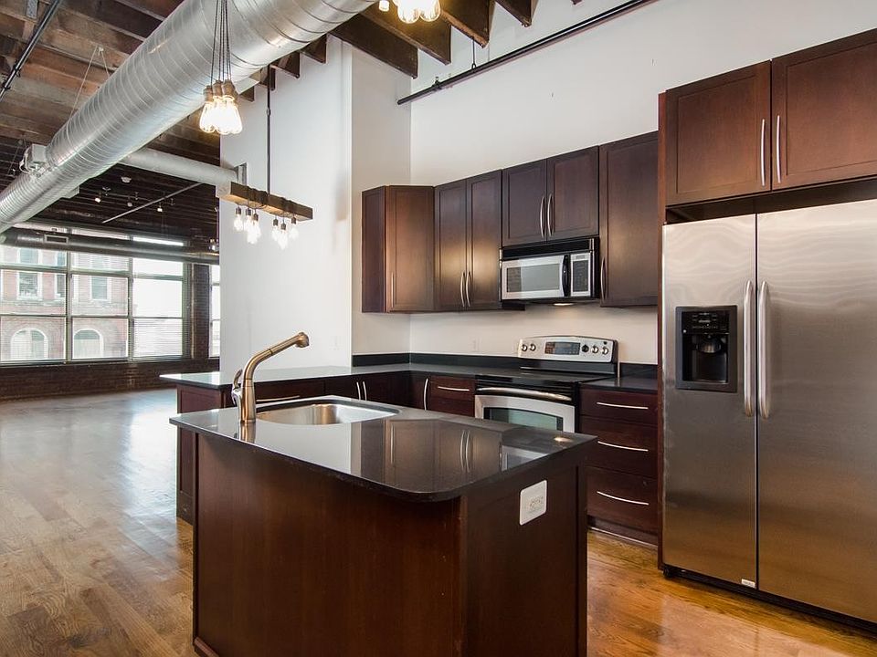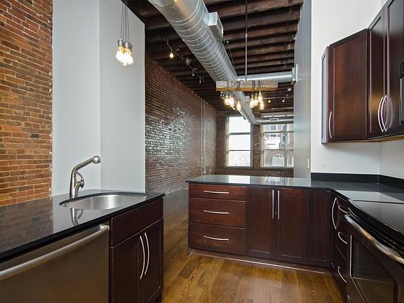 Stunning and spacious historic loft - original brick walls, 13' ceilings, chef's kitchen, hardwood floors throughout, keyless entry, automated lighting, heated tile floors in bath, and garage parking. Only 8 units in this private building with controlled entry and key code elevator. Walk to some of downtown's best restaurants and entertainment!