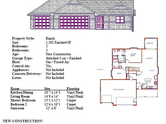 Welcome home with this Open Concept Zero Entry New Construction Ranch home with 2 bedrooms, 2 full baths. You will love the bright living area with vinyl plank flooring with white cabinets & trim, you will also enjoy the 4 seasons room overlooking the nice yard. The master suite has a tray ceiling and bath has a walk in shower and double sinks and a large walk in closet. You will love the finished garage with a utility sink. The lower level is waiting to be finished with 2 egress windows and stubbed for a bath.
