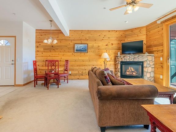 Comfortable, mountainy mid-level condominium at Grand View Villas. The covered porch is like an extension of your living area, with a breath-taking view of Mount Baldy. Within several blocks - an easy walk, enjoy lakeside parks, shops, restaurants and the convenience of grocery stores. River rock fireplace in the open living/ dining/ kitchen area is natural gas. 2 bedrooms, 2 full baths. Single car garage available. Small-Med Sized Dog okay. Tenants Responsible for Gas and Electric. Sewer, Water and Trash included into rent. Furnished Condo