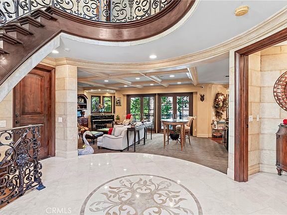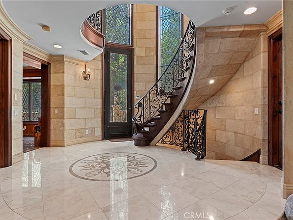 A grand entrance with marble flooring and arched beveled glass opens to soaring ceilings, custom hand-painted walls and ceilings, and graceful spiral staircases with intricate wrought iron railings. The state-of-the-art gourmet kitchen with high-end appliances and dining area are complemented by elegant arches, columns, and multiple entertaining spaces, including a home office, wet bar, and an impressive indoor spa. The home boasts 11 fireplaces, a steam shower, and 5 luxurious en-suite bedrooms.