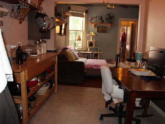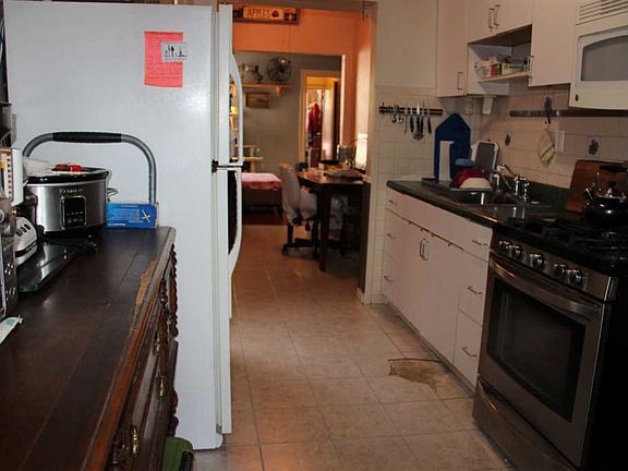 Spacious condo two bedroom on opposite sides of home. Dining room with wainscot and chair molding and faux cooper detail ceilings in both dining and kitchen. Exposed brick in living room. Built in hutch for extra exposure of china or bar. Needs repair