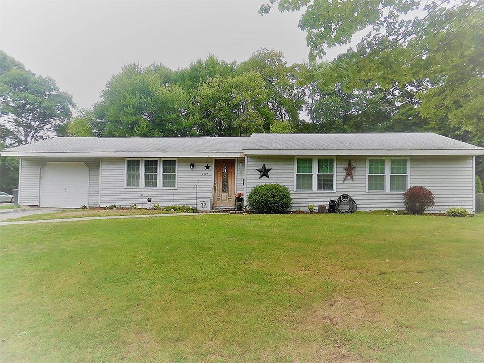 Come take a look at this single level Ranch style home. Featuring living room with gas fireplace, dining room with sliding glass doors leading to a large patio, laundry located right off the kitchen, 4 bedrooms, 1 1/2 bathrooms, heated garage with garage door opener, attic storage, above ground pool with deck and a shed. Updates include windows, heating, central air and additional insulation.