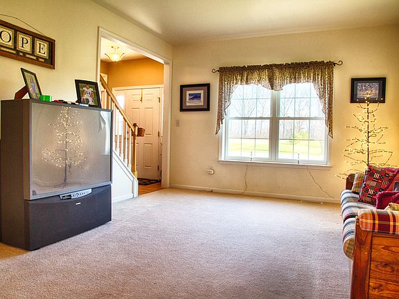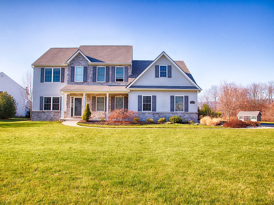 This 4 bedroom 2.5 bath colonial is situated on a private one acre lot at the end of a quiet cul de sac and less then one mile from the route 33-512 interchange. This home has a very open feel with a large family room with vaulted ceilings, wood burning fireplace, skylights and an abundance of light. The kitchen offers solid surface counter tops, a center island, stainless steel appliances and wood floors. There is a first floor office with french doors, generous size living room and dining rm which also offers hardwood floors. The master bedroom suite has a a nice size walk in closet, a master bath with tile, a jacuzzi tub, separate shower & double bowls sinks. There is a custom paver patio, walk way & mature landscaping. The shed will remain, the appliances are negotiable & a 13 month home warranty is included.