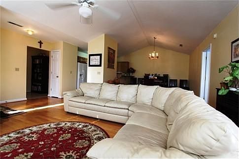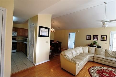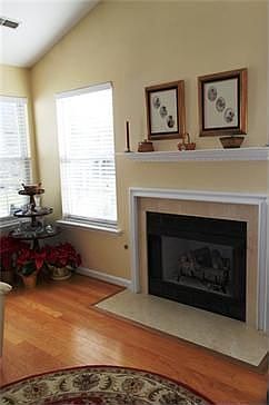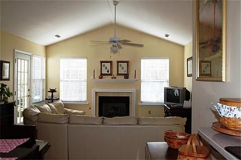 Nice one level home. Perfect for a first time home buyer or a family looking to downsize and make life easier! Vaulted ceiling and wood floors in the living and dining room. Open floor plan so creates spacious feel. Natural gas log fireplace, quartz counter tops in the kitchen and tiled floors in the bathrooms & kitchen. Master bathroom has double vanities and garden tub. Attic access with pull down stairs and flooring for additional storage space. Backs up to common area and view of the lake!